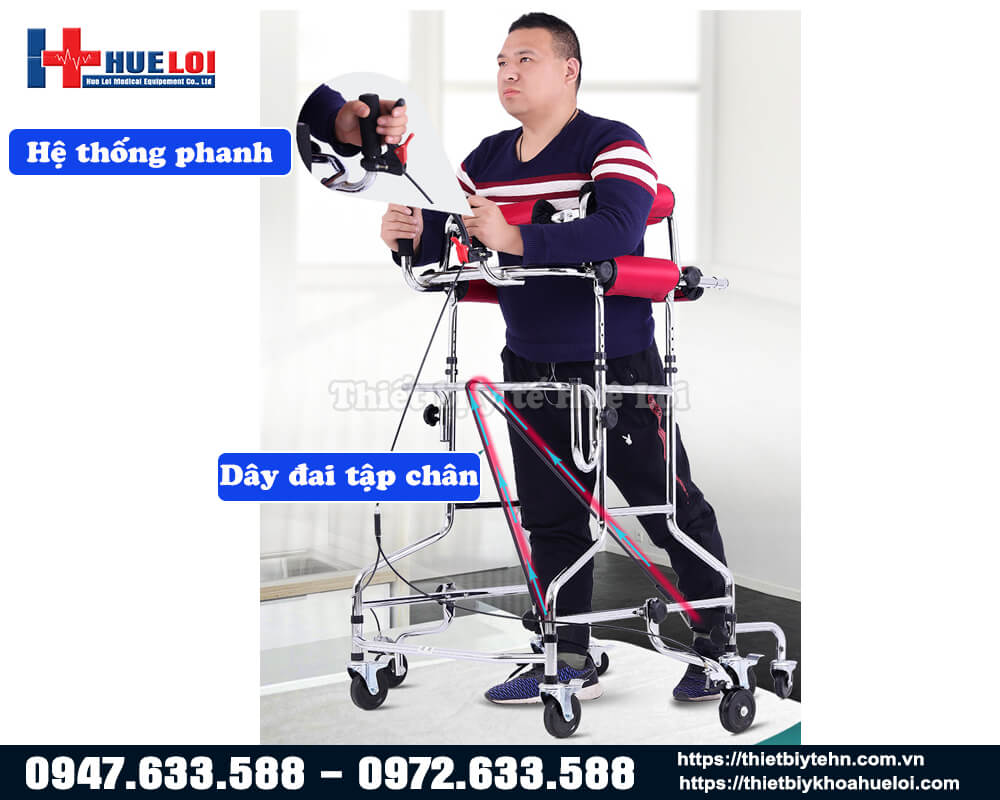 - Khung giúp người bệnh đứng thẳng bằng hệ thống đai đỡ, không cần người nhà đỡ